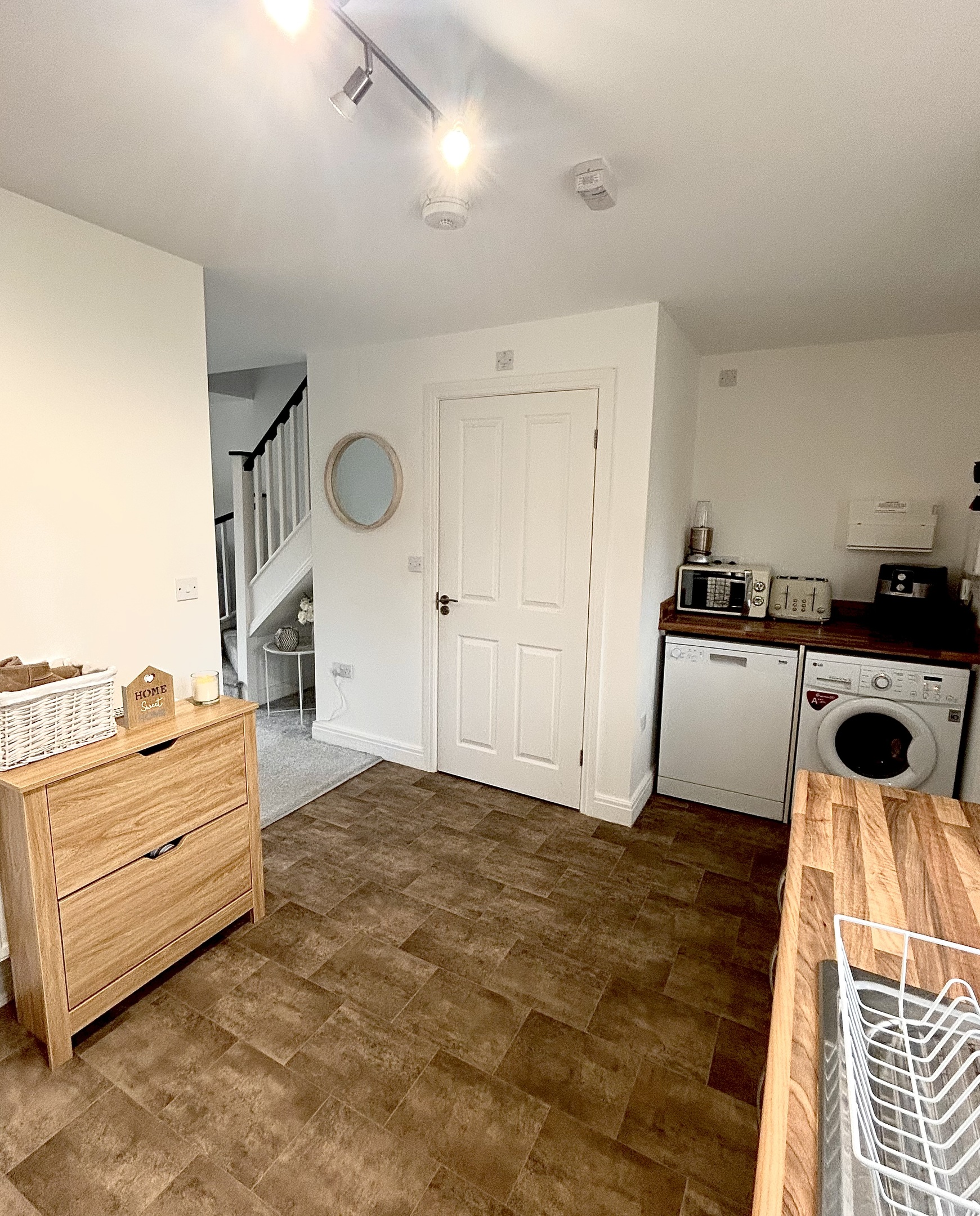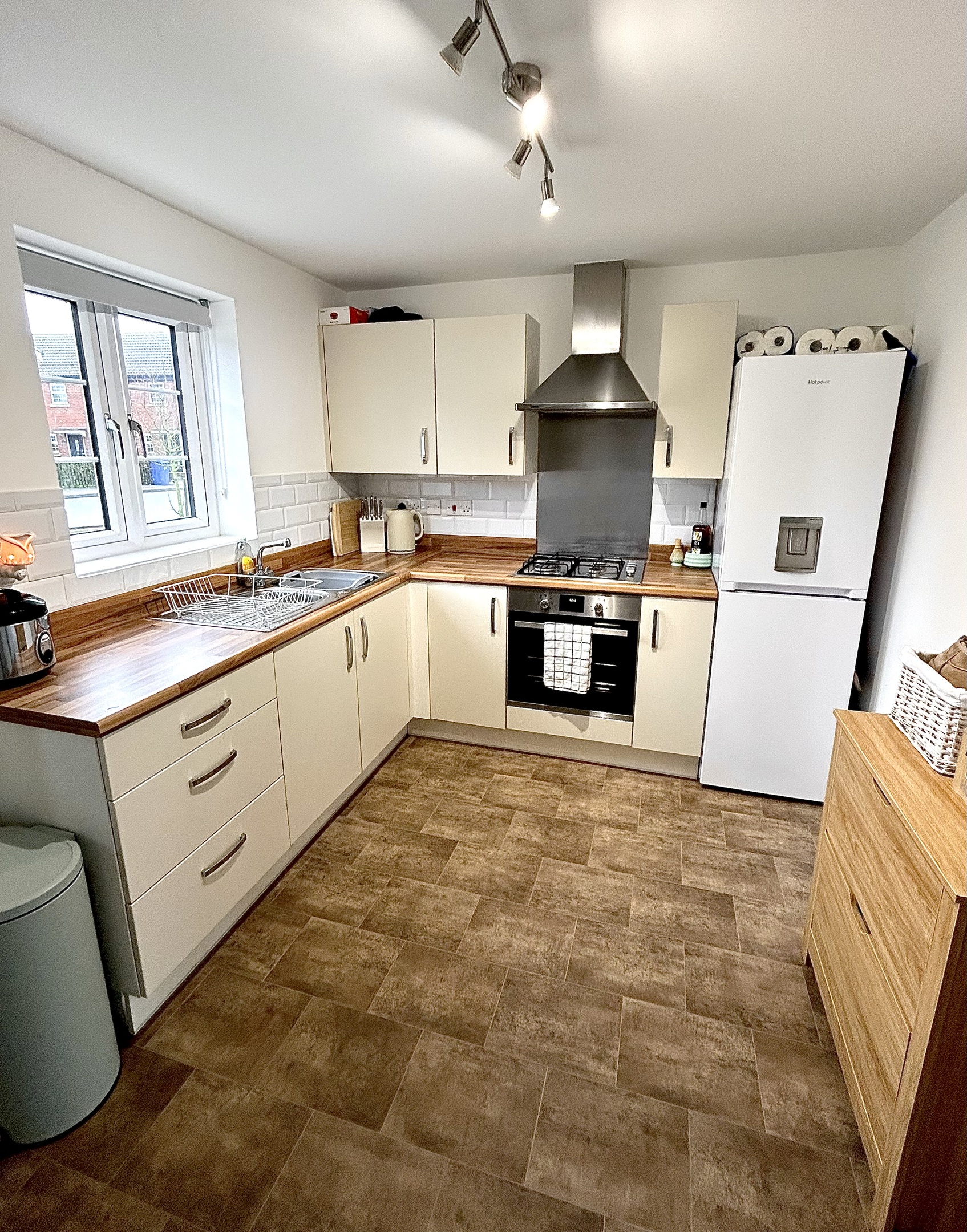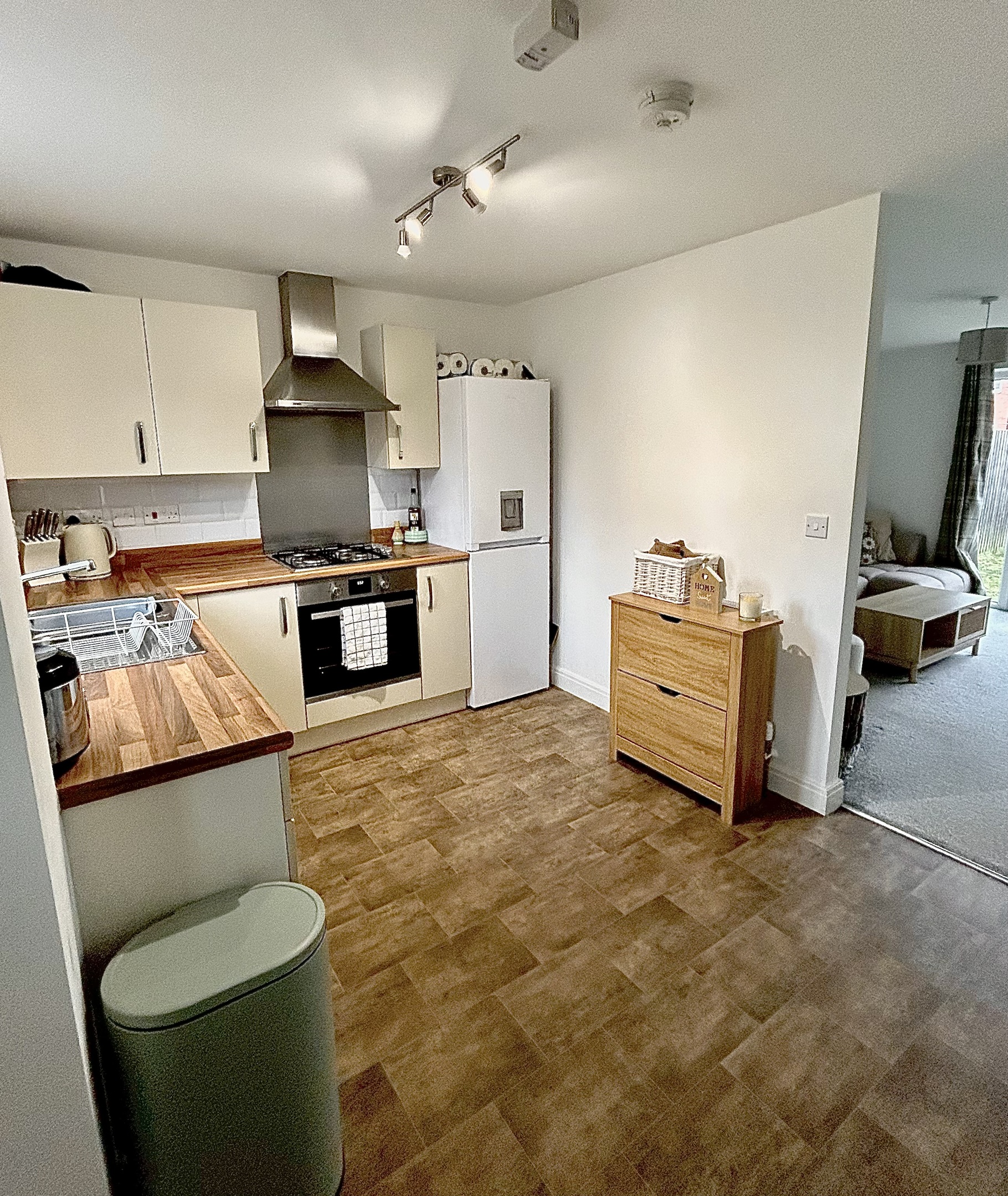 •Spacious Open Kitchen with an integrated oven and 4 Ring Gas Hob, Space for a Tall Fridge-Freezer. There’s a Stylish Coffee-Nook on the opposite side of the kitchen with space/plumbing for a Dishwasher and Washing machine