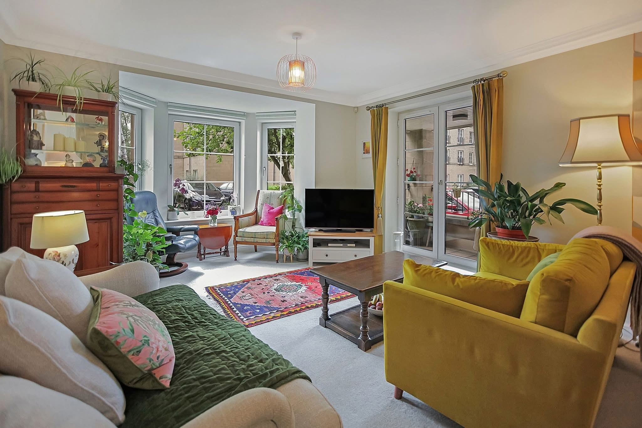 Large open plan living/dining room with feature bay window and balcony reached by patio doors,