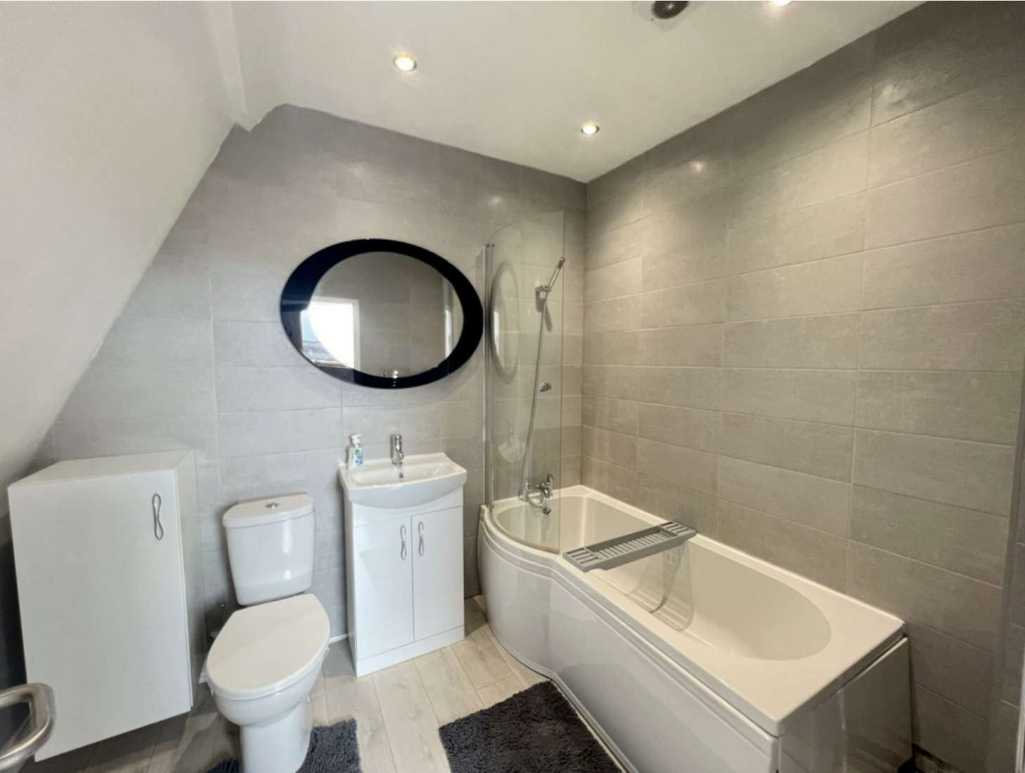 The well-proportioned bedroom is beautifully presented with built-in wardrobe space and complemented by a modern white bathroom suite.