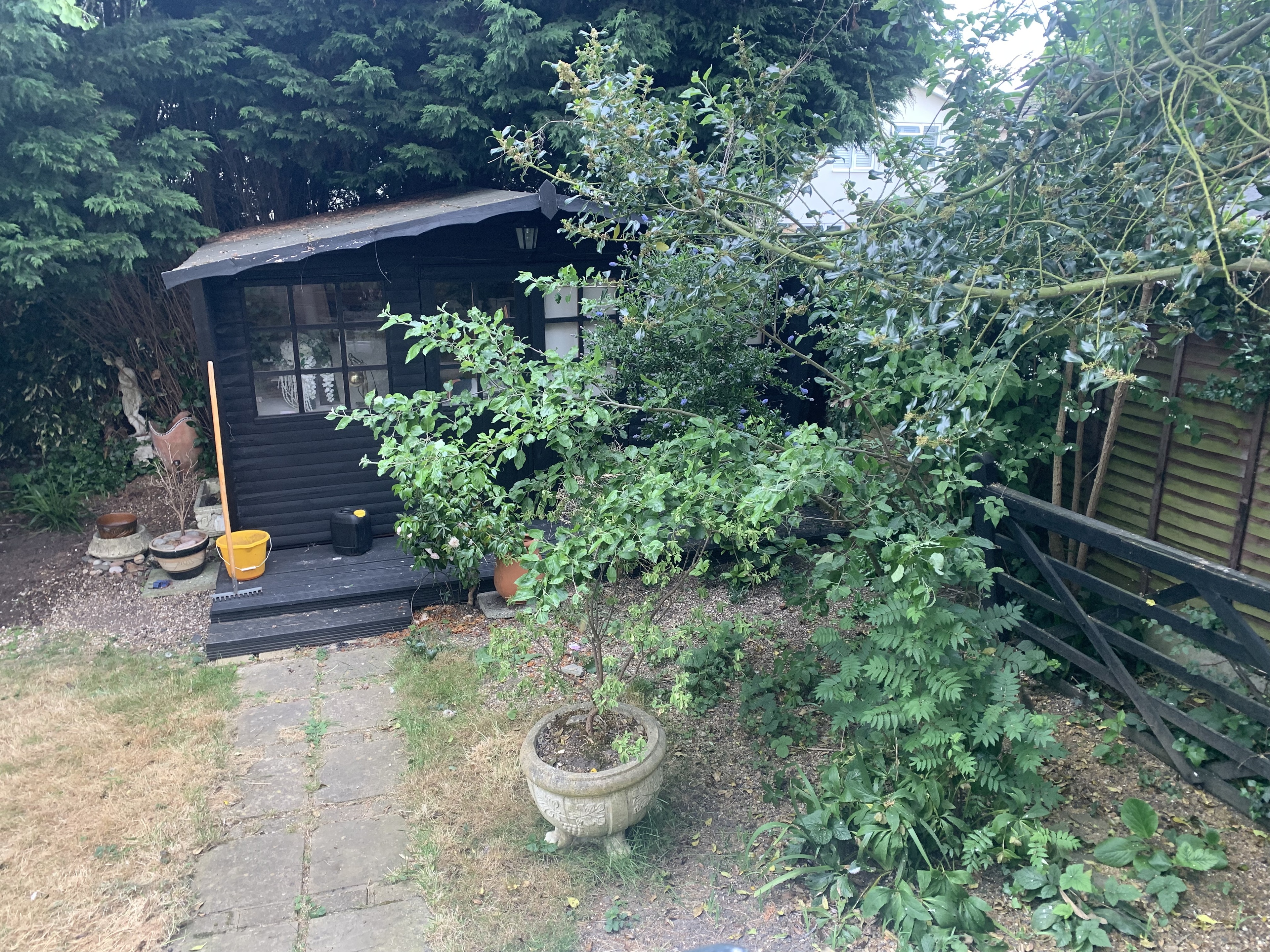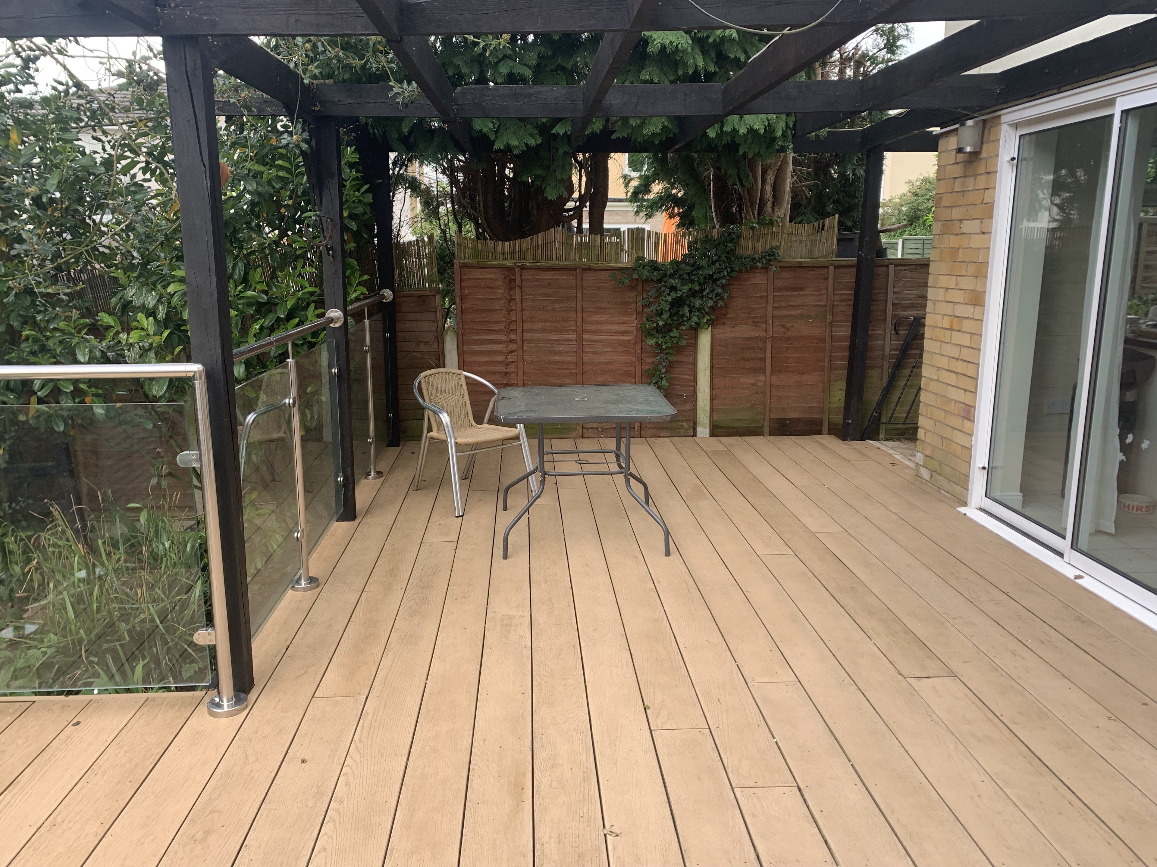 Accessible rear garden with decking, lower lawn area, and summerhouse – accessible via steps or lift