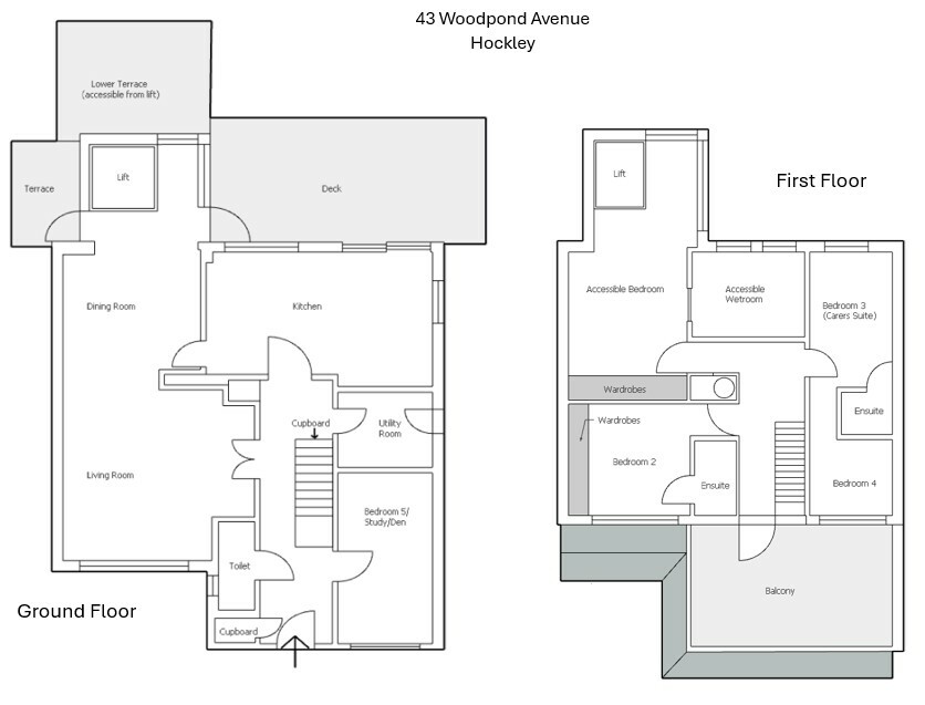 Accessible 4-bed home in Hockley, Essex. Wheelchair-friendly with ramped access, through-floor lift, wet room, ceiling hoists, and flexible layout. Includes utility room, double garage, driveway, balcony, and accessible garden with decking and lift access